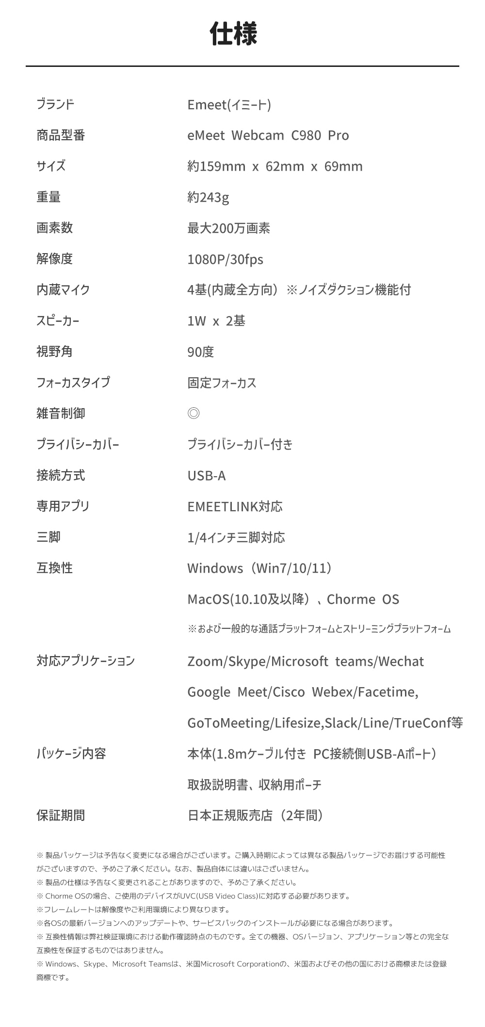 商品名 |EMEET SmartCam C980 Pro 代表カラー |ブラック クリップ式 |有 解像度 | 30fps 有効画素数 |三つ フォーカスタイプ |200万画素 インターフェース | USB-A 保証期間 |日本正規販売店(2年間) |